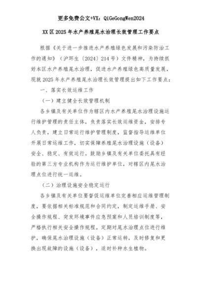 【七哥公文】2025年:XX区2025年水产养殖尾水治理长效管理工作要点+更多免费公文+VX:QiGeGongWen2024+更多免费公文+VX:QiGeGongWen2024