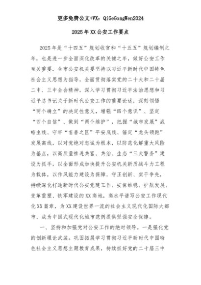 【七哥公文】2025年:2025年XX公安工作要点+更多免费公文+VX:QiGeGongWen2024+更多免费公文+VX:QiGeGongWen2024