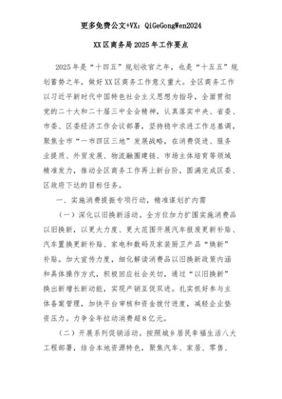 【七哥公文】2025年:XX区商务局2025年工作要点+更多免费公文+VX:QiGeGongWen2024+更多免费公文+VX:QiGeGongWen2024