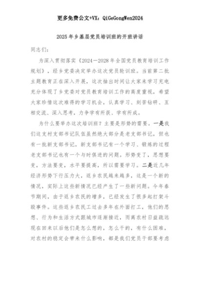 【七哥公文】2025年:2025年乡基层党员培训班的开班讲话+更多免费公文+VX:QiGeGongWen2024+更多免费公文+VX:QiGeGongWen2024