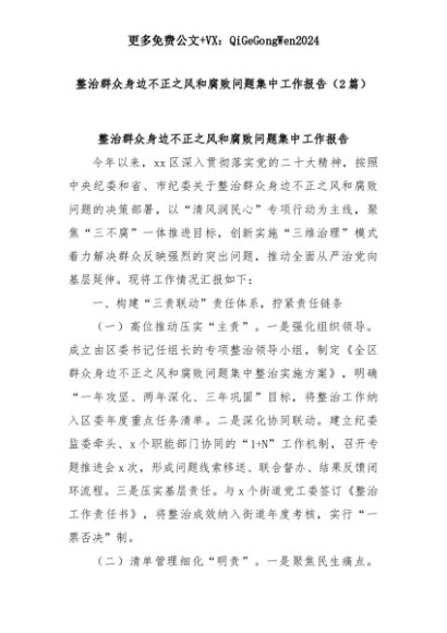 【七哥公文】2025年:(2篇)整治群众身边不正之风和腐败问题集中工作报告+更多免费公文+VX:QiGeGongWen2024+更多免费公文+VX:QiGeGongWen2024