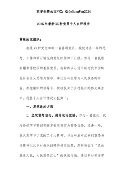 【七哥公文】2025年:2025年最新XX村党员个人自评报告+更多免费公文+VX:QiGeGongWen2024+更多免费公文+VX:QiGeGongWen2024