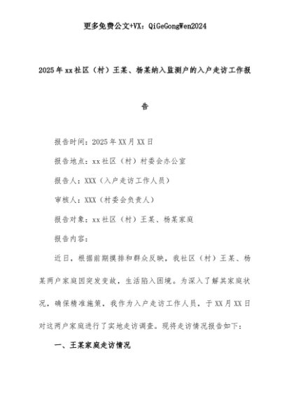 【七哥公文】2025年:2025年xx社区(村)王某、杨某纳入监测户的入户走访工作报告+更多免费公文+VX:QiGeGongWen2024+更多免费公文+VX:QiGeGongWen2024