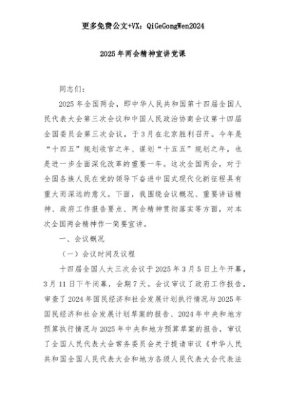 【七哥公文】2025年:2025年两会精神宣讲党课+更多免费公文+VX:QiGeGongWen2024+更多免费公文+VX:QiGeGongWen2024