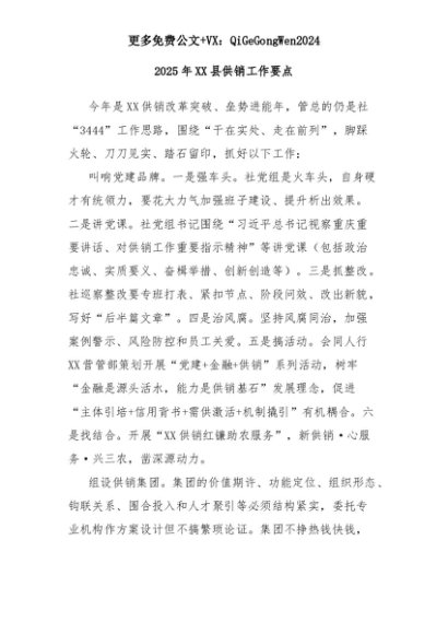 【七哥公文】2025年:2025年XX县供销工作要点+更多免费公文+VX:QiGeGongWen2024+更多免费公文+VX:QiGeGongWen2024