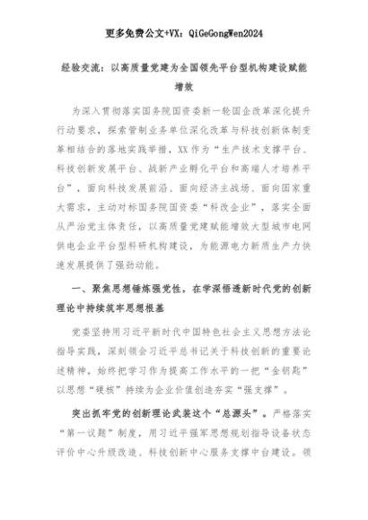 【七哥公文】2025年:经验交流:以高质量党建为全国领先平台型机构建设赋能增效+更多免费公文+VX:QiGeGongWen2024+更多免费公文+VX:QiGeGongWen2024