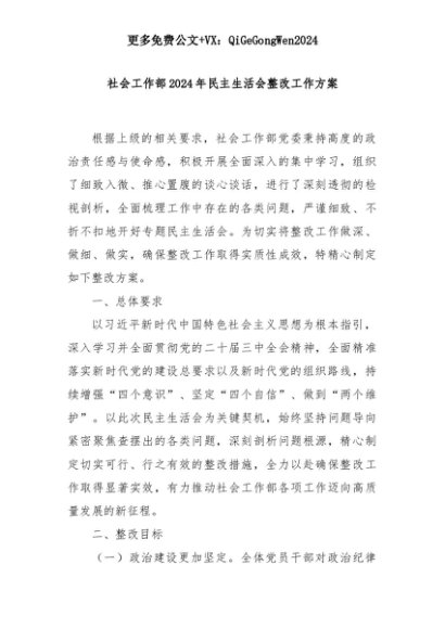 【七哥公文】2025年:社会工作部2024年民主生活会整改工作方案+更多免费公文+VX:QiGeGongWen2024+更多免费公文+VX:QiGeGongWen2024