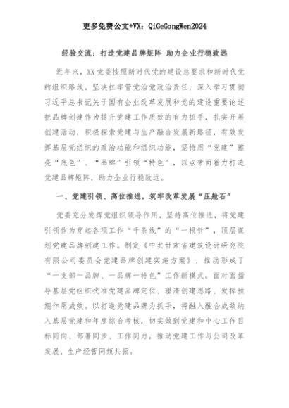 【七哥公文】2025年:经验交流:打造党建品牌矩阵 助力企业行稳致远+更多免费公文+VX:QiGeGongWen2024+更多免费公文+VX:QiGeGongWen2024
