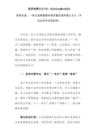 【七哥公文】2025年:经验交流:一体化党建凝聚起高质量发展的强大合力(外包业务单位党组织)+更多免费公文+VX:QiGeGongWen2024+更多免费公文+VX:QiGeGongWen2024