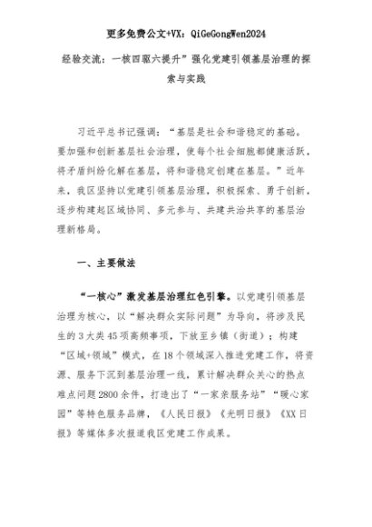 【七哥公文】2025年:经验交流:一核四驱六提升”强化党建引领基层治理的探索与实践+更多免费公文+VX:QiGeGongWen2024+更多免费公文+VX:QiGeGongWen2024