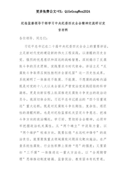 【七哥公文】2025年:纪检监察领导干部学习中央纪委四次全会精神交流研讨发言材料+更多免费公文+VX:QiGeGongWen2024+更多免费公文+VX:QiGeGongWen2024