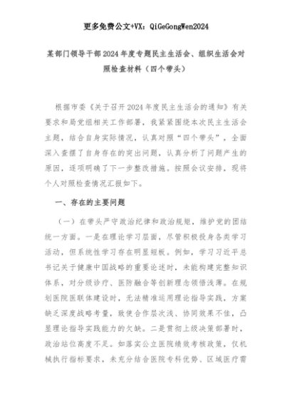 【七哥公文】2025年:某部门领导干部2024年度专题民主生活会、组织生活会对照检查材料(四个带头)+更多免费公文+VX:QiGeGongWen2024+更多免费公文+VX:QiGeGongWen2024