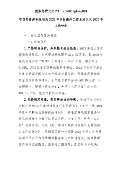 【七哥公文】2025年:市自然资源和规划局2024年乡村振兴工作总结以及2025年工作计划+更多免费公文+VX:QiGeGongWen2024+更多免费公文+VX:QiGeGongWen2024