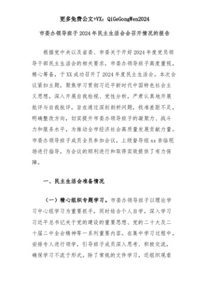 【七哥公文】2025年:市委办领导班子2024年民主生活会会召开情况的报告+更多免费公文+VX:QiGeGongWen2024+更多免费公文+VX:QiGeGongWen2024