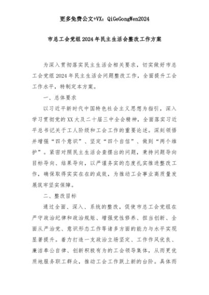 【七哥公文】2025年:市总工会党组2024年民主生活会整改工作方案+更多免费公文+VX:QiGeGongWen2024+更多免费公文+VX:QiGeGongWen2024