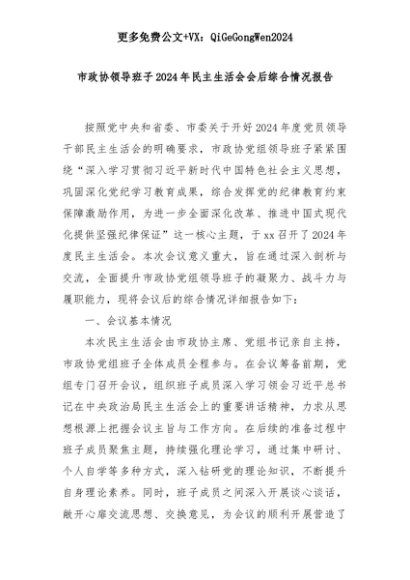 【七哥公文】2025年:市政协领导班子2024年民主生活会会后综合情况报告+更多免费公文+VX:QiGeGongWen2024+更多免费公文+VX:QiGeGongWen2024