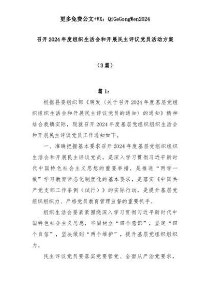 【七哥公文】2025年:(3篇)召开 2024 年度组织生活会和开展民主评议党员活动方案+更多免费公文+VX:QiGeGongWen2024+更多免费公文+VX:QiGeGongWen2024