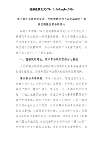 【七哥公文】2025年:国企青年工作经验交流:发挥党建引领“四轮驱动力”助推团建激发青年新活力+更多免费公文+VX:QiGeGongWen2024+更多免费公文+VX:QiGeGongWen2024