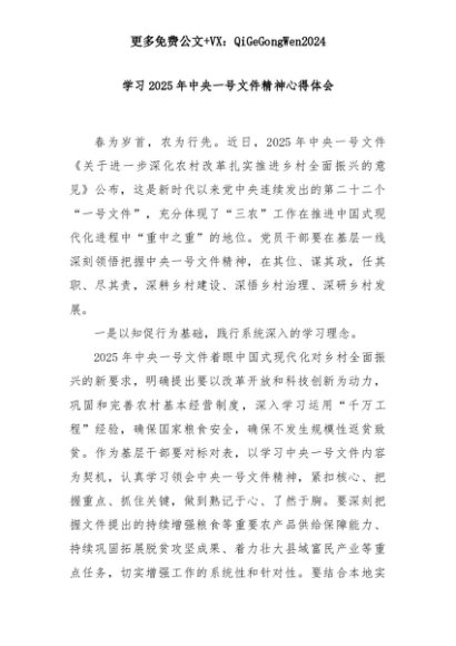 【七哥公文】2025年:学习2025年中央一号文件精神心得体会+更多免费公文+VX:QiGeGongWen2024+更多免费公文+VX:QiGeGongWen2024