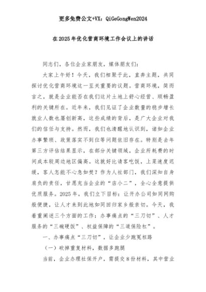 【七哥公文】2025年:在2025年优化营商环境工作会议上的讲话+更多免费公文+VX:QiGeGongWen2024+更多免费公文+VX:QiGeGongWen2024
