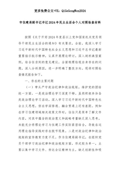 【七哥公文】2025年:市住建局副书记书记2024年民主生活会个人对照检查材料+更多免费公文+VX:QiGeGongWen2024+更多免费公文+VX:QiGeGongWen2024
