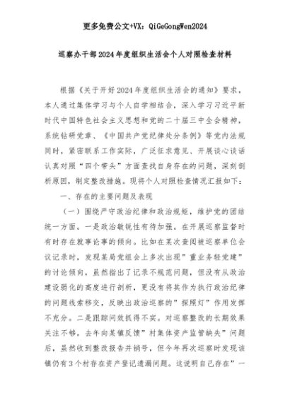 【七哥公文】2025年:巡察办干部2024年度组织生活会个人对照检查材料+更多免费公文+VX:QiGeGongWen2024+更多免费公文+VX:QiGeGongWen2024