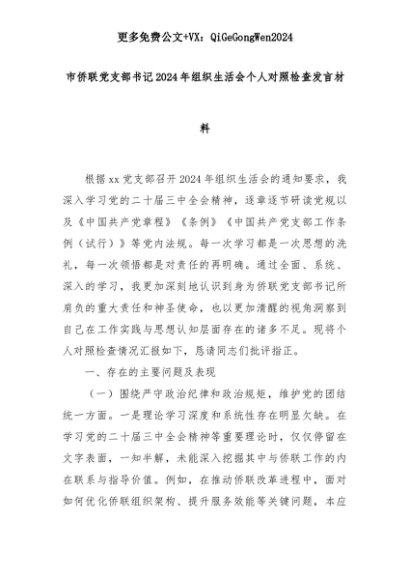 【七哥公文】2025年:市侨联党支部书记2024年组织生活会个人对照检查发言材料+更多免费公文+VX:QiGeGongWen2024+更多免费公文+VX:QiGeGongWen2024