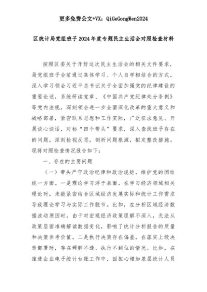 【七哥公文】2025年:区统计局党组班子2024年度专题民主生活会对照检查材料+更多免费公文+VX:QiGeGongWen2024+更多免费公文+VX:QiGeGongWen2024