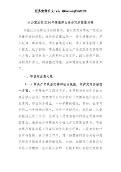 【七哥公文】2025年:办公室主任2024年度组织生活会对照检查材料+更多免费公文+VX:QiGeGongWen2024+更多免费公文+VX:QiGeGongWen2024