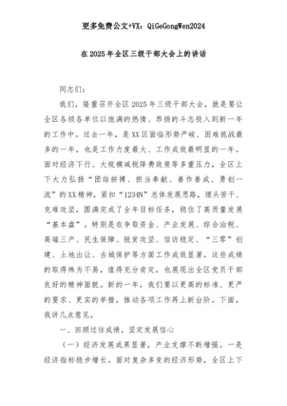 【七哥公文】2025年:在2025年全区三级干部大会上的讲话+更多免费公文+VX:QiGeGongWen2024+更多免费公文+VX:QiGeGongWen2024