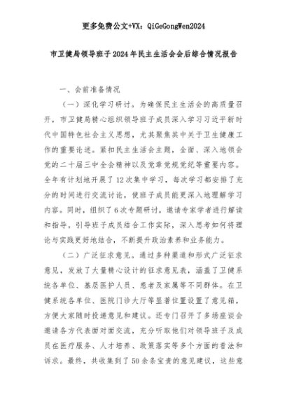 【七哥公文】2025年:市卫健局领导班子2024年民主生活会会后综合情况报告+更多免费公文+VX:QiGeGongWen2024+更多免费公文+VX:QiGeGongWen2024