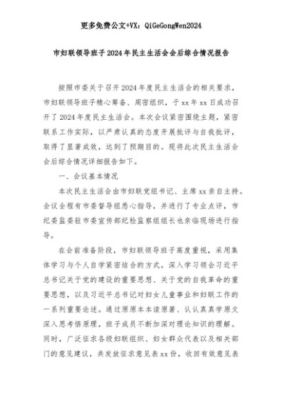 【七哥公文】2025年:市妇联领导班子2024年民主生活会会后综合情况报告+更多免费公文+VX:QiGeGongWen2024+更多免费公文+VX:QiGeGongWen2024