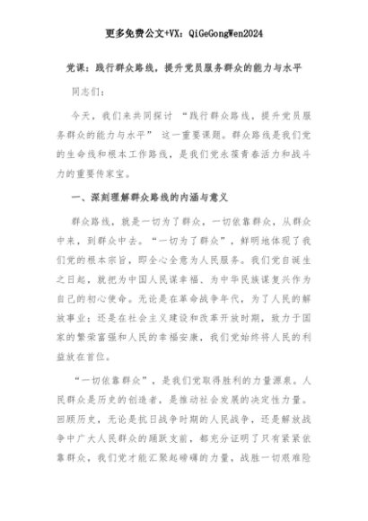 【七哥公文】2025年:党课:践行群众路线,提升党员服务群众的能力与水平+更多免费公文+VX:QiGeGongWen2024+更多免费公文+VX:QiGeGongWen2024