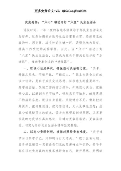 【七哥公文】2025年:交流感悟:“六心”驱动开好“六度”民主生活会+更多免费公文+VX:QiGeGongWen2024+更多免费公文+VX:QiGeGongWen2024