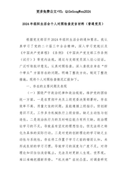 【七哥公文】2025年:2024年组织生活会个人对照检查发言材料(普通党员)+更多免费公文+VX:QiGeGongWen2024+更多免费公文+VX:QiGeGongWen2024