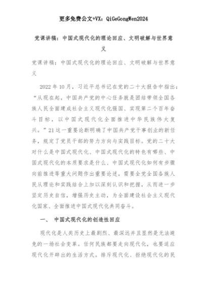 【七哥公文】2025年:党课讲稿:中国式现代化的理论回应、文明破解与世界意义+更多免费公文+VX:QiGeGongWen2024+更多免费公文+VX:QiGeGongWen2024
