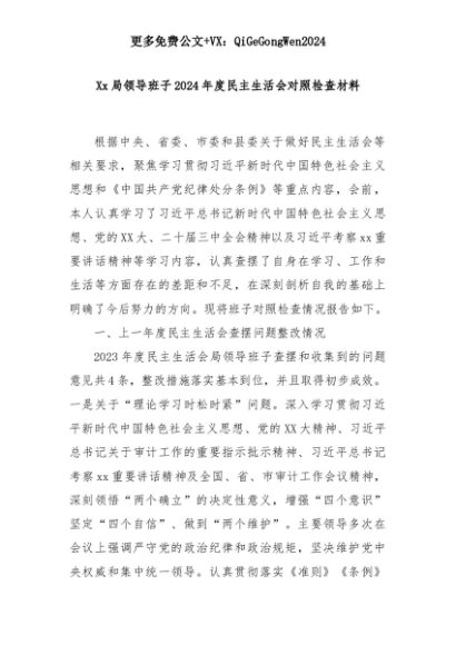 【七哥公文】2025年:Xx局领导班子2024年度民主生活会对照检查材料+更多免费公文+VX:QiGeGongWen2024+更多免费公文+VX:QiGeGongWen2024