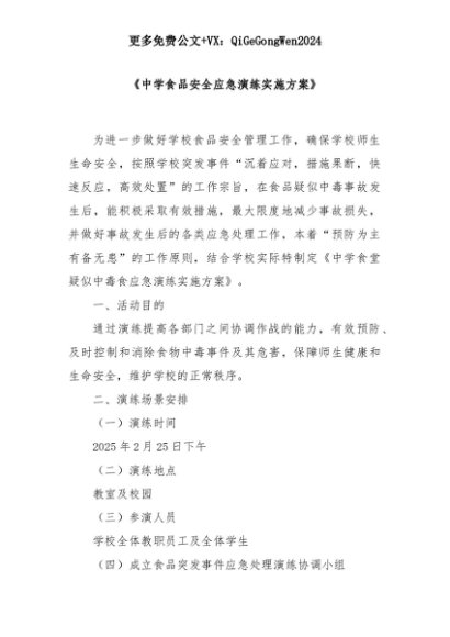 【七哥公文】2025年:中学食品安全应急演练实施方案+更多免费公文+VX:QiGeGongWen2024+更多免费公文+VX:QiGeGongWen2024