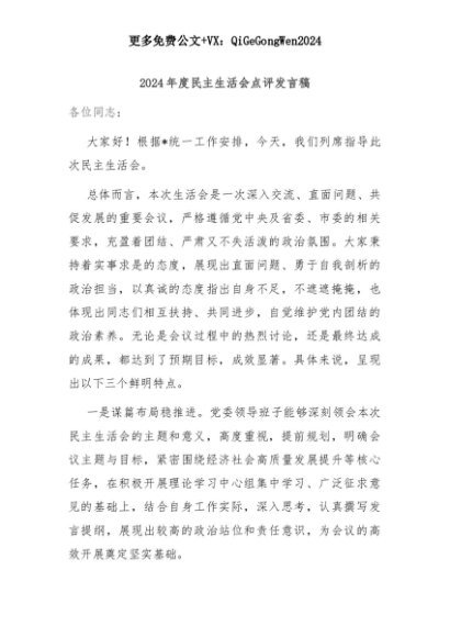 【七哥公文】2025年:2024年度民主生活会点评发言稿+更多免费公文+VX:QiGeGongWen2024+更多免费公文+VX:QiGeGongWen2024