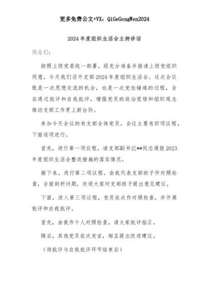 【七哥公文】2025年:2024年度组织生活会主持讲话+更多免费公文+VX:QiGeGongWen2024+更多免费公文+VX:QiGeGongWen2024