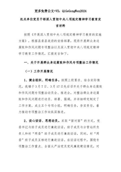 【七哥公文】2025年:机关单位党员干部深入贯彻中央八项规定精神学习教育发言材料+更多免费公文+VX:QiGeGongWen2024+更多免费公文+VX:QiGeGongWen2024