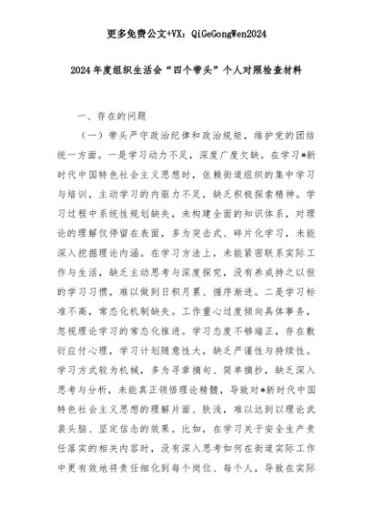 【七哥公文】2025年:2024年度组织生活会“四个带头”个人对照检查材料+更多免费公文+VX:QiGeGongWen2024+更多免费公文+VX:QiGeGongWen2024