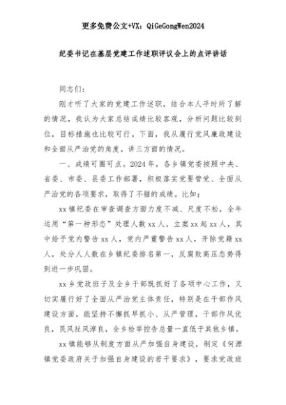 【七哥公文】2025年:纪委书记在基层党建工作述职评议会上的点评讲话+更多免费公文+VX:QiGeGongWen2024+更多免费公文+VX:QiGeGongWen2024