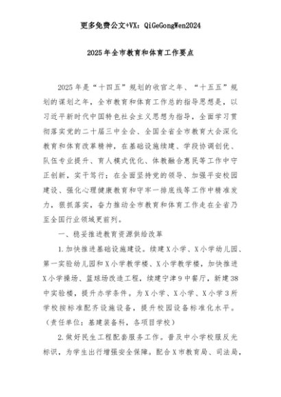 【七哥公文】2025年:2025年全市教育和体育工作要点+更多免费公文+VX:QiGeGongWen2024+更多免费公文+VX:QiGeGongWen2024