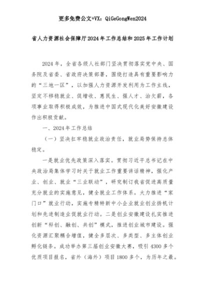 【七哥公文】2025年:省人力资源社会保障厅2024年工作总结和2025年工作计划+更多免费公文+VX:QiGeGongWen2024+更多免费公文+VX:QiGeGongWen2024