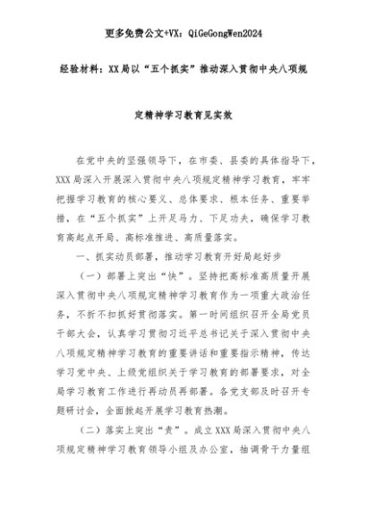 【七哥公文】2025年:经验材料:XX局以“五个抓实”推动深入贯彻中央八项规定精神学习教育见实效+更多免费公文+VX:QiGeGongWen2024+更多免费公文+VX:QiGeGongWen2024