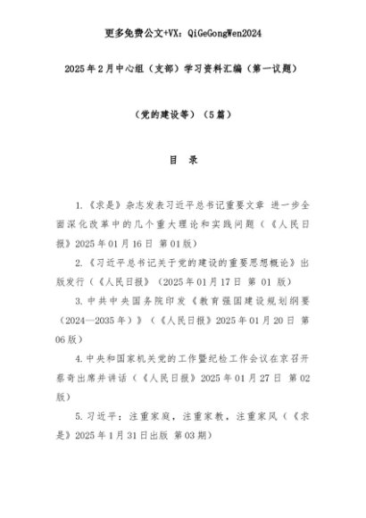 【七哥公文】2025年:(5篇)2025年2月中心组(支部)学习资料汇编(第一议题)(党的建设等)+更多免费公文+VX:QiGeGongWen2024+更多免费公文+VX:QiGeGongWen2024