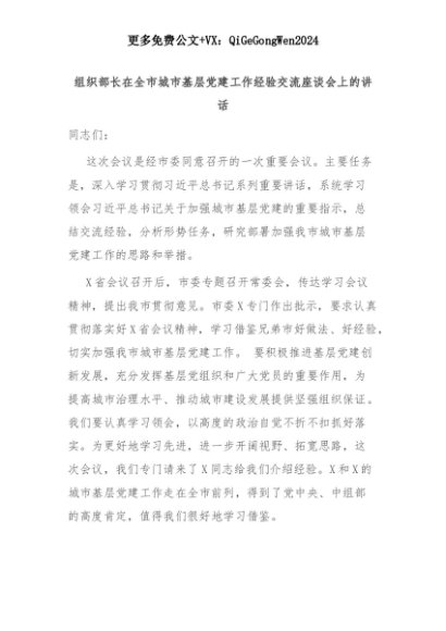 【七哥公文】2025年:组织部长在全市城市基层党建工作经验交流座谈会上的讲话+更多免费公文+VX:QiGeGongWen2024+更多免费公文+VX:QiGeGongWen2024