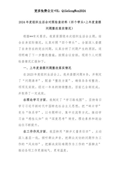【七哥公文】2025年:2024年度组织生活会对照检查材料(四个带头+上年度查摆问题整改落实情况)+更多免费公文+VX:QiGeGongWen2024+更多免费公文+VX:QiGeGongWen2024