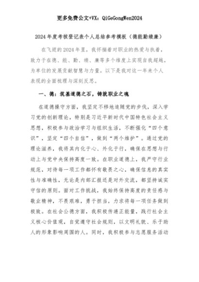 【七哥公文】2025年:2024年度考核登记表个人总结参考模板(德能勤绩廉)+更多免费公文+VX:QiGeGongWen2024+更多免费公文+VX:QiGeGongWen2024